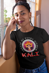 This stylish "GODDESS KALI" printed black t-shirt for women combines quality and fashion. Made of comfortable and durable material, it effortlessly elevates any outfit. The unique "KALI" print adds a touch of personality, making it a must-have for any wardrobe. Upgrade your style with this versatile and trendy t-shirt.