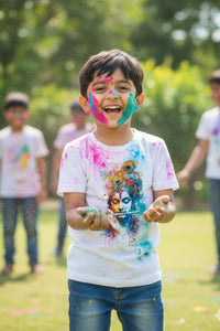 Celebrate the festival of colors with this vibrant Holi Kids Polyester T-shirt, designed for young ones to enjoy the festivities in comfort and style. Crafted from durable polyester fabric, this tee offers excellent color retention and easy care—simply machine wash and it's ready for the next celebration. The lightweight material keeps kids cool during outdoor play and color-throwing activities. Available in cheerful hues that complement the festive spirit, this t-shirt combines practicality with celebratory appeal, making it an ideal choice for Holi gatherings, family events, and everyday wear.