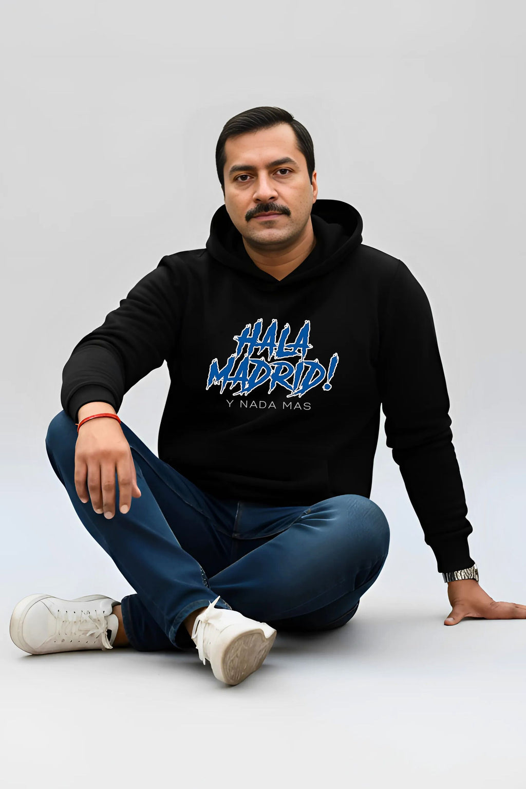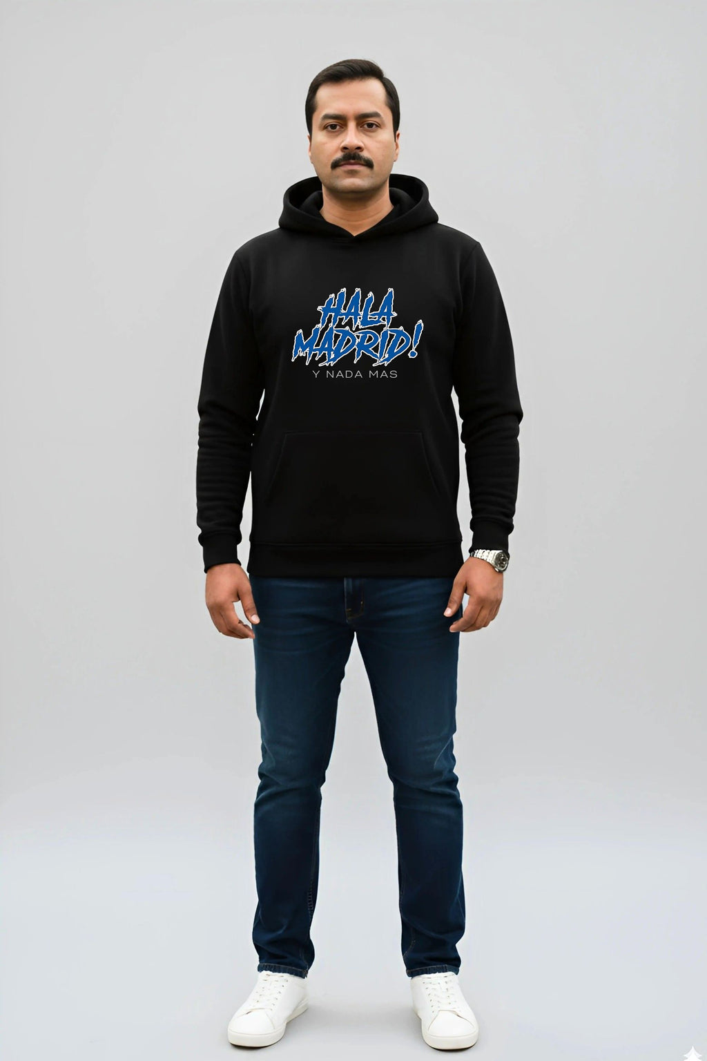 Show your club devotion with the Madrid Passion Limited Edition Hoodie in rich black, crafted from ultra-soft 320 GSM fabric for unbeatable comfort and warmth. Featuring the vibrant "Hala Madrid! Y Nada Mas" slogan on the chest, this hoodie is the ultimate outerwear for fans who celebrate both sport and city lifestyle with bold flair.